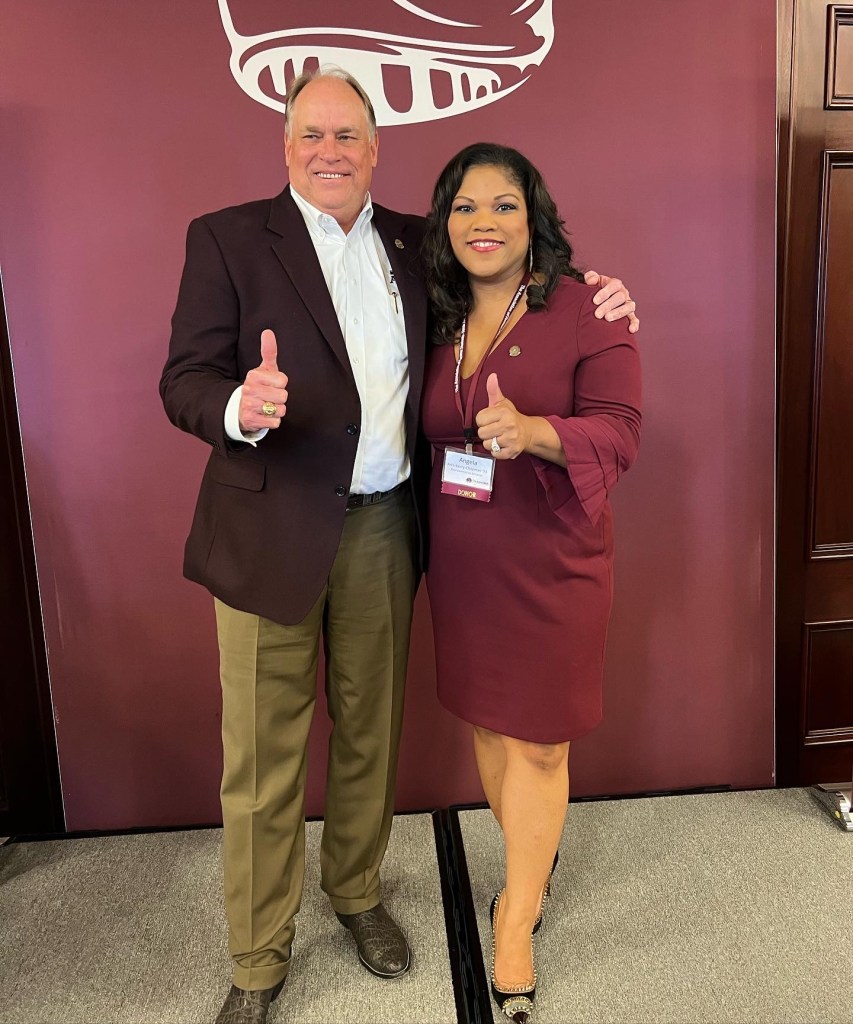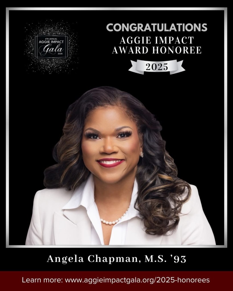 Through every role, Angela leads with purpose, invests with intention, and continues to leave a legacy rooted in service, equity, and transformational impact. She leads by example and demonstrates the Aggie core values: Respect, Excellence, Leadership, Loyalty, Integrity, and Selfless Service
