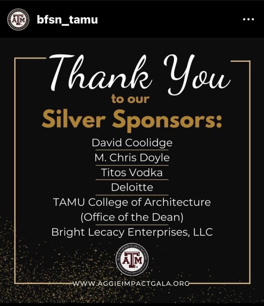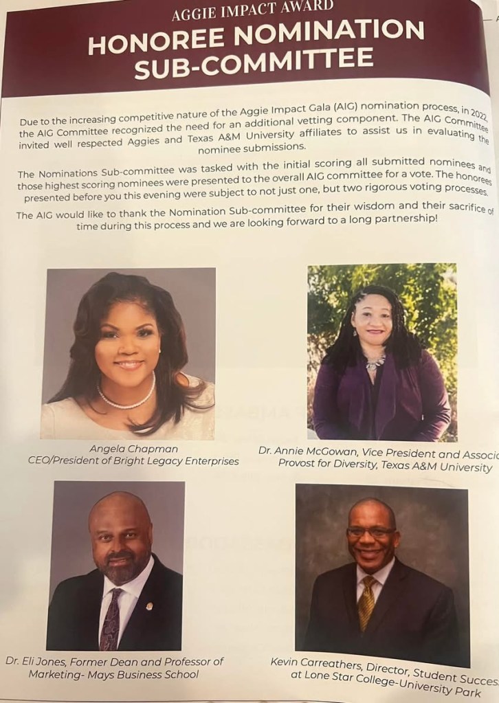 Angela is also a proud member of the Black Former Student Network (BFSN) and a committed Sponsor of the Aggie Impact Gala each year, a powerful celebration of Black excellence, scholarship, and community at Texas A&M. She has contributed to the BFSN Endowed Foundation Excellence Award, awarding deserving Black students, the Kevin Carreathers Award for Impact and Service and recently has been selected as one of the 2025 Aggie Impact Gala Award Honorees, a prestigious honor bestowed upon a former student of Texas A&M University. The award, sponsored by the first Constituent Network of The Association of Former Students, Texas A&M Black Former Student Network, recognizes individual persons who have made a positive IMPACT on society by setting themselves apart by excelling in their profession, their undying commitment to serving society and his/her community, and by their service to Black students, faculty, and former students of Texas A&M University.